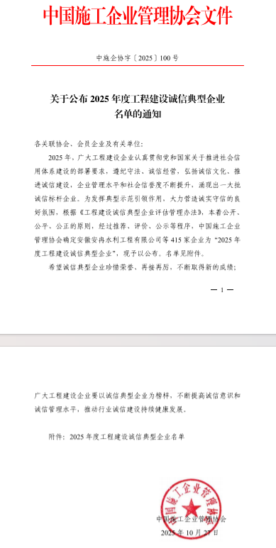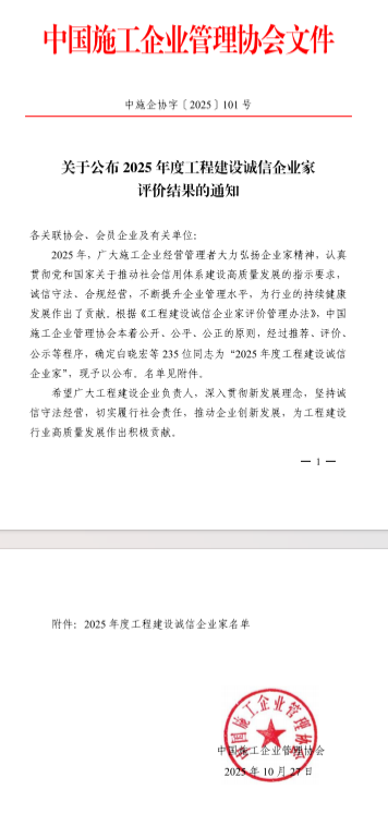 工程建設(shè)誠信典型企業(yè)評價工作是由中國施工企業(yè)管理協(xié)會組織開展,旨在增強(qiáng)工程建設(shè)行業(yè)自律意識,提高合規(guī)管理水平,推動行業(yè)信用建設(shè)高質(zhì)量發(fā)展。本次獲評,充分彰顯了業(yè)界對公司長期以來堅持誠信經(jīng)營、推動行業(yè)高質(zhì)量發(fā)展的高度認(rèn)可。